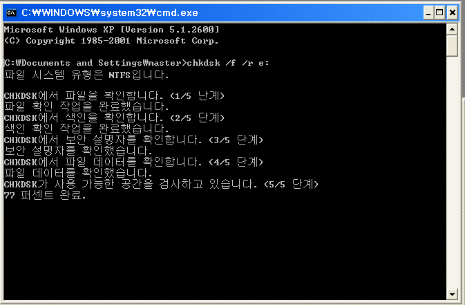 chksdk /f /r e: 를 실행을 한 후입니다.