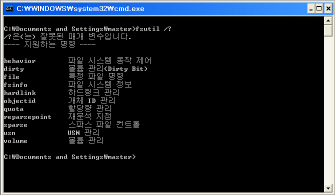 fsutil는 파일시스템 도구(File System Utility)입니다. 위와 같이 11개의 명령어를 통해 사용가능합니다.
