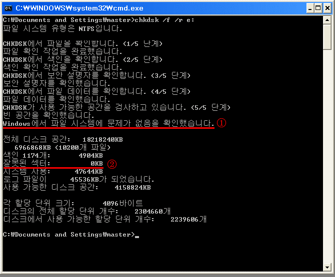 chkdsk가 완료된 화면입니다.
