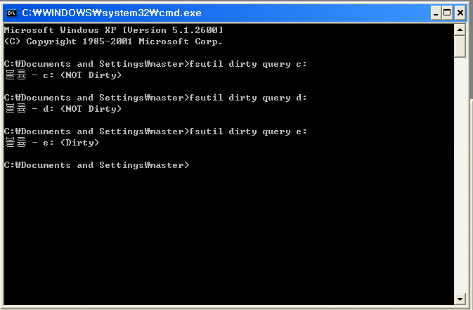 명령프롬프트 (실행/cmd)에서 드라이브가 Dirty / Not Dirty 인지를 구분해 봅니다.