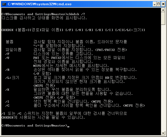chkdsk명령어에 대해 자세히 알고 싶으시면 chkdsk /?라고 입력하시면 다음과 같은 옵션들을 볼 수 있습니다.