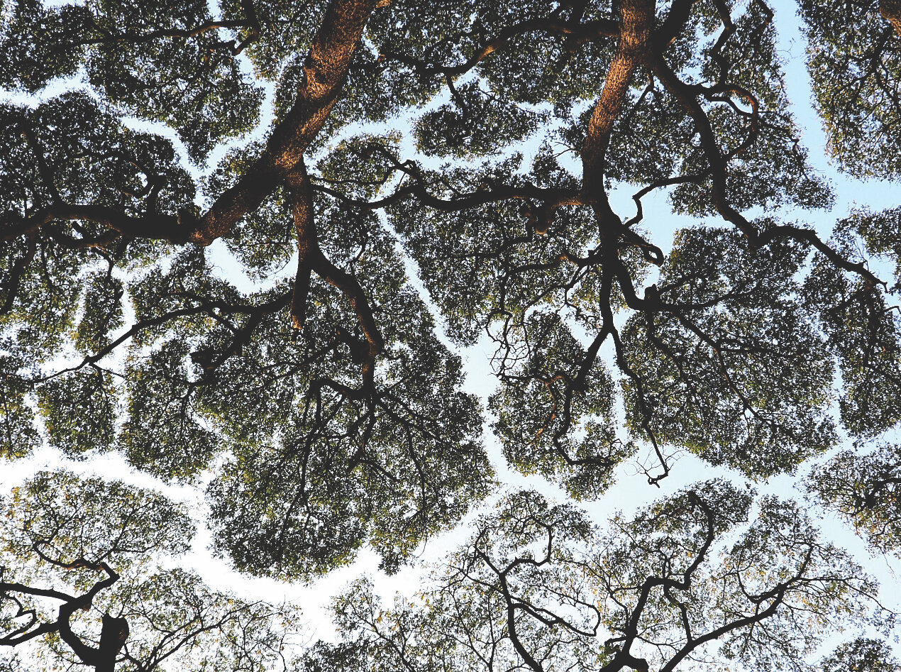 수관기피 현상(crown shyness)은 나무들의 상단 부분인 수관(crown)이 서로 닿지 않도록 자연스럽게 공간을 유지하는 현상을 말합니다. 이 현상은 나무들이 서로의 가지와 잎사귀를 피해 자연적인 간격을 유지하며 성장하는 모습으로 알려져 있습니다. 이 현상은 주로 고유한 시각적인 효과를 만들어내는 것으로 유명하며, 관찰하는 사람들에게 아름다운 광경을 선사합니다.