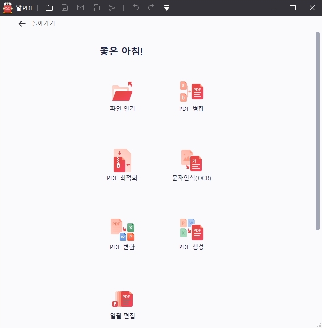 - 알PDF 화면에서 "파일 열기"를 클릭하여 변환하고자 하는 PDF 파일을 불러옵니다.