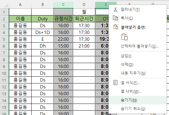 초과 근무 시간을 계산하는 기본 공식을 설정합니다. 일반적으로 초과 근무 시간은 실제 퇴근 시간에서 규정 퇴근 시간을 빼는 방식으로 계산됩니다. 그러나 3교대 근무의 경우 자정을 넘길 수 있기 때문에 추가적인 고려가 필요합니다.