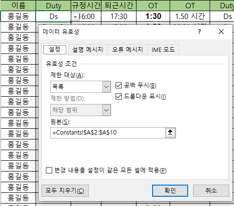 Constants시트에서 참조합니다. 이 시트의 값을 셀 영역으로 설정하여 드롭다운 목록에서 선택할 수 있도록 합니다.