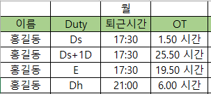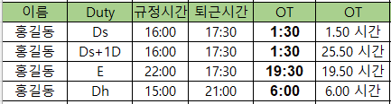 - 기본 공식: 초과 근무 시간 = 실제 퇴근 시간 - 규정 퇴근 시간