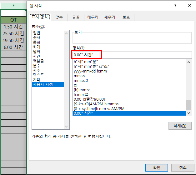 초과 근무 시간은 일반적으로 소수점 형태로 표현됩니다. 이를 위해 계산된 초과 근무 시간을 시간 단위로 변환하고 소수점 형태로 표시합니다. 예를 들어, 시간과 분을 계산하여 소수점 형태로 변환하는 방법은 다음과 같습니다: