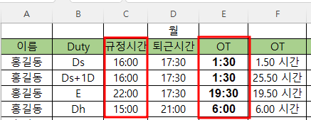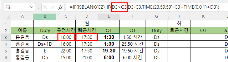 초과 근무 시간을 계산하는 기본 공식을 설정합니다. 일반적으로 초과 근무 시간은 실제 퇴근 시간에서 규정 퇴근 시간을 빼는 방식으로 계산됩니다. 그러나 3교대 근무의 경우 자정을 넘길 수 있기 때문에 추가적인 고려가 필요합니다.