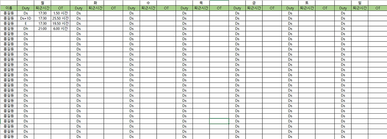 일주일치의 초과 근무 시간을 관리하기 위해서는 계산된 초과 근무 시간을 복사하여 일주일의 일정에 맞게 배열합니다. 드롭다운 목록과 계산식을 포함한 열을 복사하여 여러 날짜에 대한 초과 근무 시간을 입력할 수 있습니다.
