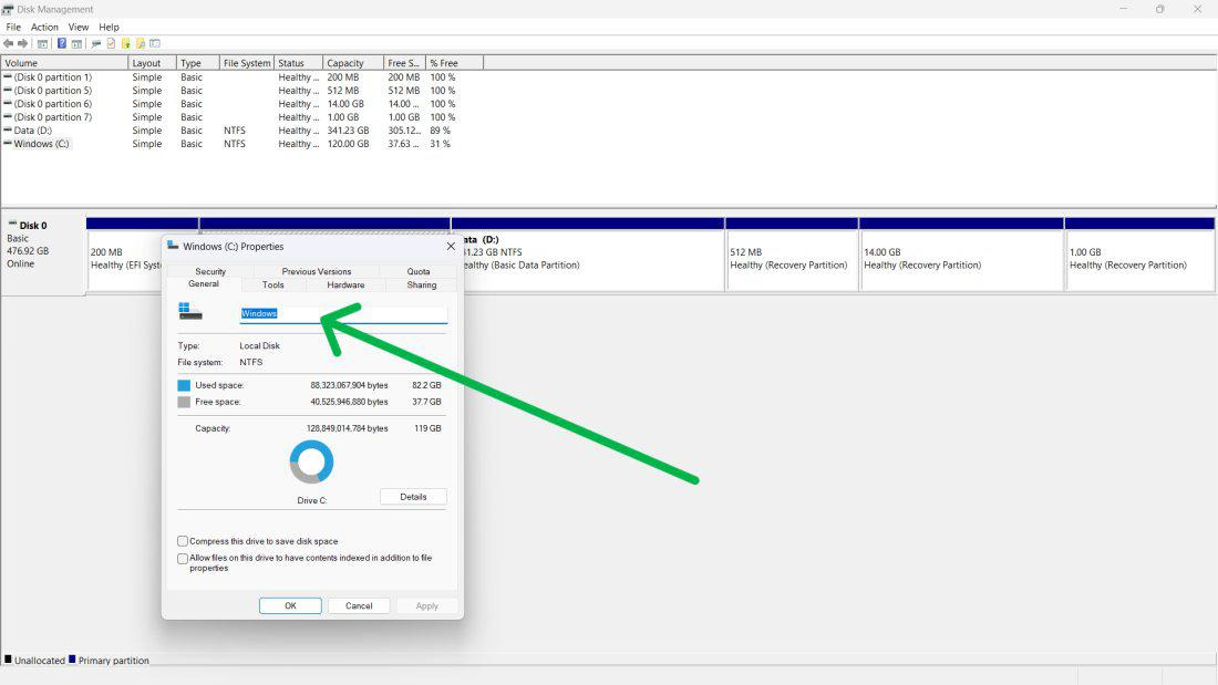 - 디스크 이름 변경: 속성 창에서 '일반' 탭을 선택하고, 디스크 이름을 클릭하여 새로운 이름을 입력한 후 '확인'을 클릭합니다.