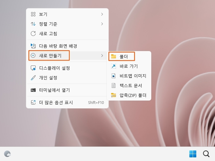 바탕화면에서 마우스 오른쪽 버튼을 클릭하여 "새로 만들기"를 선택한 후 "폴더"를 클릭합니다.