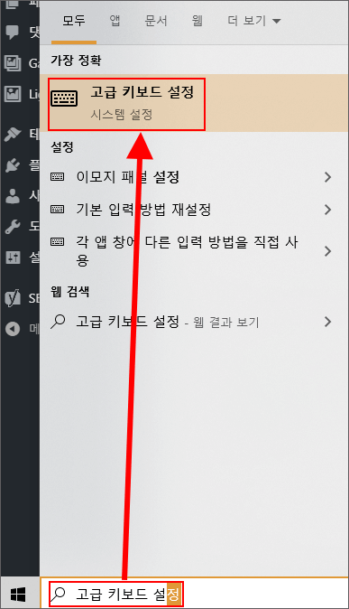 - 윈도우 10 검색창에 "고급 키보드 설정"을 입력하여 해당 설정 창으로 이동합니다.