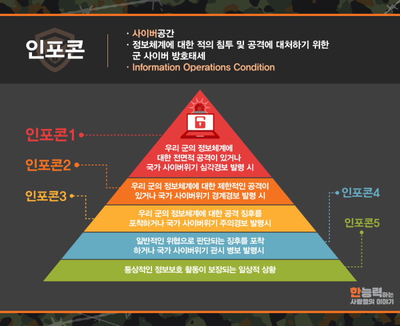 인포콘, 사이버 공격, 국방 정보화 체계, 정보작전 방호태세, 전면적 공격 대응, 제한적 공격, 특정 공격 위험, 증가된 사이버 위험, 통상적 사이버 활동, 한국군 사이버 안보