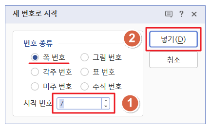 - 새 번호로 시작 대화 상자가 열리면, 새로운 쪽 번호를 선택하고 시작 번호를 입력합니다.