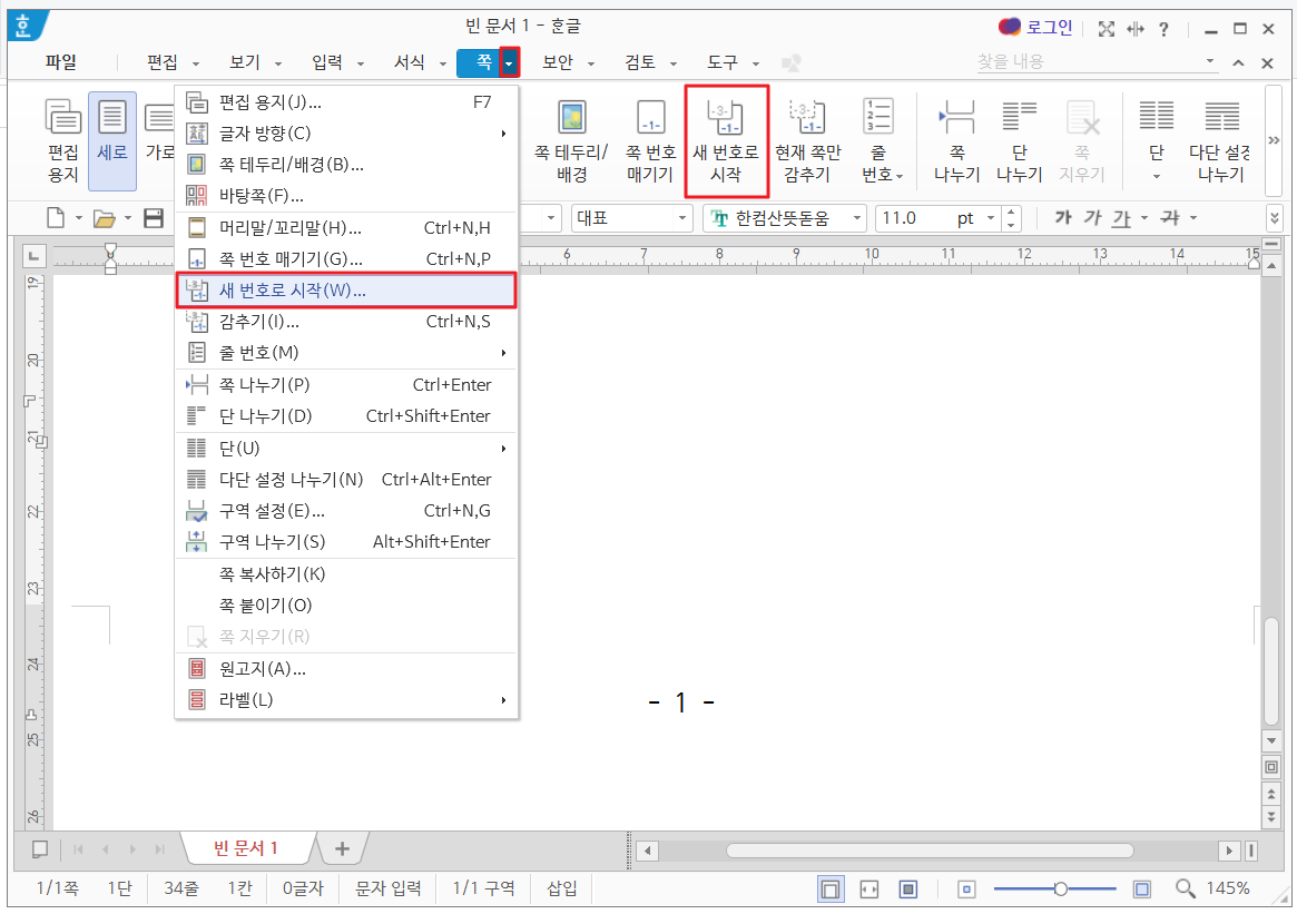 - [쪽] 탭에서 [새 번호로 시작]을 클릭하거나, 빠른 실행창에서 같은 옵션을 선택합니다.