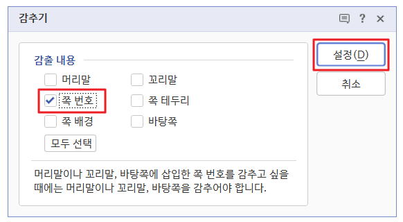 - 감추기 대화상자가 열리면, 감출 내용을 선택(쪽 번호)하고 [설정] 버튼을 클릭합니다.