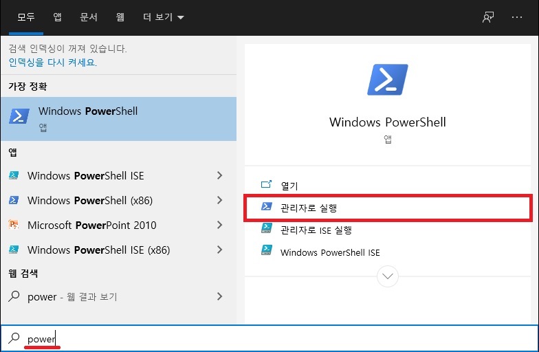 APC_INDEX_MISMATCH 오류가 발생하면 가장 먼저 확인해야 할 것은 최신 윈도우 업데이트입니다. 윈도우 업데이트와 관련된 문제가 해당 오류의 원인이 될 수 있습니다. 윈도우 시작 메뉴에서 'PowerShell'을 검색하고 우클릭하여 "관리자 권한으로 실행"을 선택합니다.